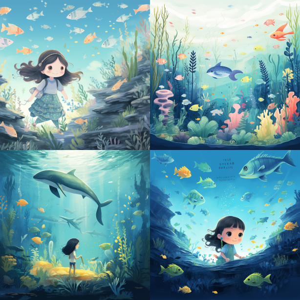 Midjourney Bot 更新时间:2023-08-31 22:18For the following story, design one cover illustration and eight illustrations related to the story. The cover illustration and illustrations related to the story should be presented in the form of a picture book. The design should be original, child-friendly, suitable for elementary school students' aesthetic sense, and simple. The story is as follows: In a beautiful underwater world, there lived a little fish named Little Fish. Little Fish was very kind and friendly. He was always willing to help others and solve problems for other marine creatures. One day, Little Fish noticed a lonely little turtle floating in the ocean, looking a bit sad. Little Fish swam over and asked, "Little Turtle, what's wrong? Do you need help?" Little Turtle told Little Fish that he was lost and didn't know how to get back home. Little Fish immediately offered to help Little Turtle and suggested guiding him. They embarked on a journey of friendship together and experienced many interesting things along the way. Little Fish and Little Turtle encountered joyful dolphins who swam quickly towards them, bringing them happiness. They also met wise and kind sea turtles who gave them wisdom and courage. Finally, Little Fish successfully led Little Turtle back to his home. Little Turtle gratefully said, "Thank you, Little Fish. Without you, I might have been lost forever." Little Fish smiled and replied, "It's my honor. Friends should help each other." Since then, Little Fish and Little Turtle became the best of friends. They traveled together throughout the entire underwater world, helping other marine creatures in need. --ar 1:1 --v 5.2 --style raw
