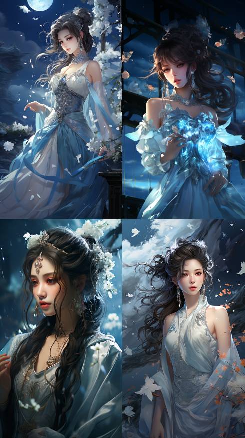 Midjourney Bot 更新时间:2023-08-31 22:38Chinese anime characters, light silver and light blue styles, beautiful women, night heart, exaggerated features, white tones, full body, anime style, Pavilion:: 3 --s 309 --ar 9:16 --style raw --v 5.2