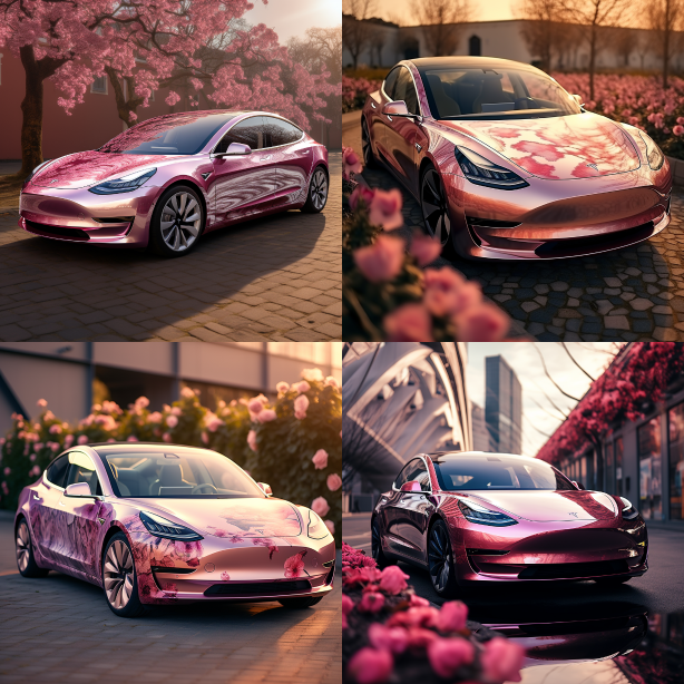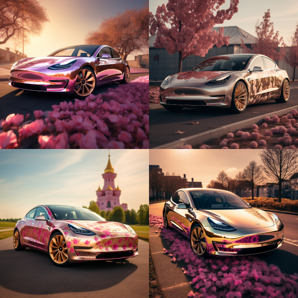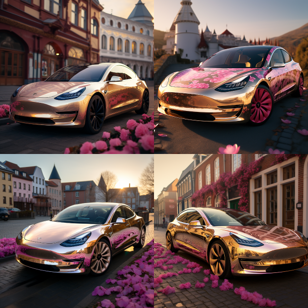 Midjourney Bot 更新时间:2023-08-31 21:37Masterpiece, high-quality, 8k, Tesla Model 3, pink side car sticker, golden wheels, on the side of the road with many flowers,Ray Tracing Reflections --ar 1:1 --style raw --v 5.2