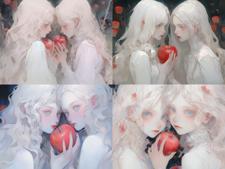 Midjourney Bot 更新时间:2023-08-31 22:09Two girl with red apples, white long hair, blue eyes, The makeup of the doll, with a matte texture and transparent colors, Imitate Hiromu Arakawa's painting style, Dream colors, delete skin texture, low capture, Dream colors, low capture, Dream colors, Loish style, Acrylic paint, Matte, surrealism, pink tones --s 96 --ar 4:3 --niji 5