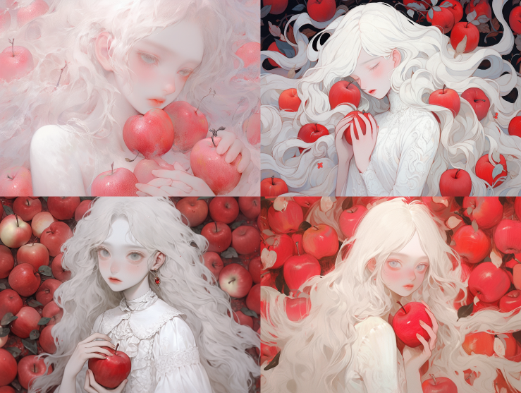Midjourney Bot 更新时间:2023-08-31 22:07The girl with red apples, white long hair, blue eyes, The makeup of the doll, with a matte texture and transparent colors, Imitate Hiromu Arakawa's painting style, Dream colors, delete skin texture, low capture, Dream colors, low capture, Dream colors, Loish style, Acrylic paint, Matte, surrealism, pink tones --s 96 --ar 4:3 --niji 5