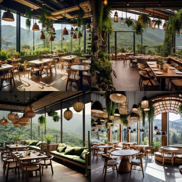 Midjourney Bot 更新时间:2023-08-31 21:55Catering space, interior design, with landscape elements, green plants, photo realism, large and bright restaurant, soft light, lighting fixtures, tables and chairs, high details, high resolution, depth of field, mid range --ar 1:1 --style raw --v 5.2