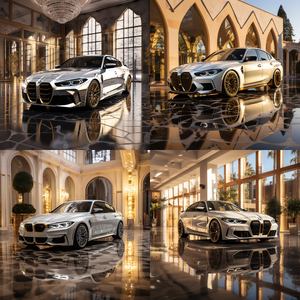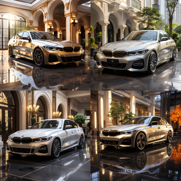 Midjourney Bot 更新时间:2023-08-31 20:40Masterpiece, high-quality, 8K, new BMW 3 Series, white+champagne gold dual carpool sticker, in villa, door open,Ray Tracing Reflections --ar 1:1 --style raw --v 5.2 --s 750