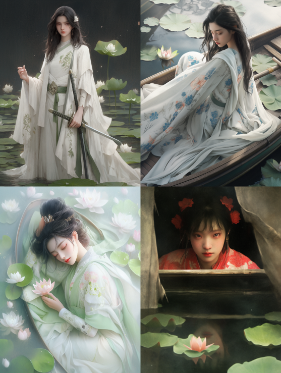 Midjourney Bot 更新时间:2023-08-31 20:42Picture full of stories, single exposure, close-upbeautiful Tang Dynasty Asian girl, martial arts actionPaulina Washington's ethereal portraiture style. Pavethe wav for light and shadow. Chinese stvle. ancientstyle, water,lotus leaf, awning boat,rvan mcginlevavered fiber stvle color veil printing, mikeCampau a touch of white powder. The Art of LightPaintingStephen Shortridge.Ilfords FX. Colorfularrangement.avant-garde design,8k, --s 140 --c 3 --ar 3:4 --niji 5