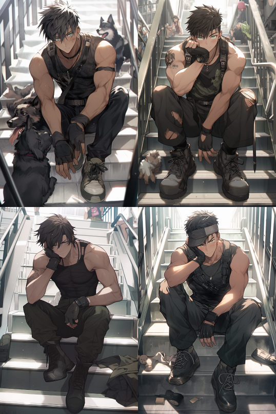 Midjourney Bot 更新时间:2023-08-31 21:03Frontal view,fullbody,a 25 years old young handsome topless_male is sitting on the stairs,crew cut,perfect face,trim physique,athletic build,pectorals and abdominals,he is wearing black_gloves,trousers,rubber_boots,topless,no shirts,without shirts,none shirts,city background,Makoto Shinkai,in the style of 2D Japanese Anime,beautiful cinematic lighting,Official Art,Pixiv Fanbox,Digital Art,Epic Portraiture,Ultra Detailed,32K Resolution,Vibrant Colors,Vivid Colors,Bright Colors,Masterpiece,Best Quality,Post Processing. --ar 2:3 --style original --niji 5 --s 750