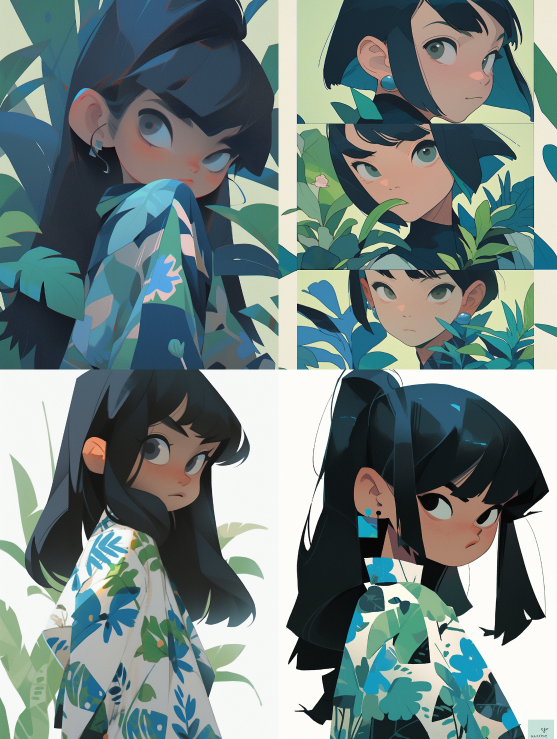 Midjourney Bot 更新时间:2023-08-31 20:38A black-haired little girl, flat illustration, various outfits, eccentric clothing, close-up of the face, portrait, blue, green, white, flat illustration, geometric shapes, minimalism, lush plants. --ar 3:4 --style expressive --niji 5 --s 750