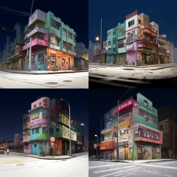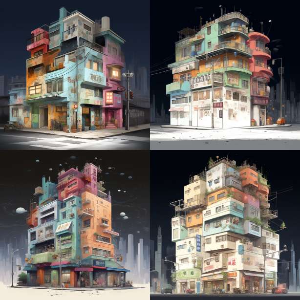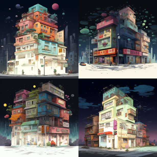 Midjourney Bot 更新时间:2023-08-31 18:41Light pollution, graffiti, neighborhoods, bright colors, cartoons, vertical paintings, individual buildings --s 300 --quality 0.25 --iw 1.5 --ar 1:1 --style raw --v 5.2