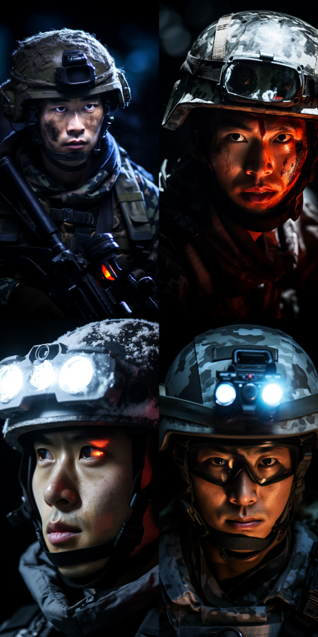Midjourney Bot 更新时间:2023-08-31 18:43A Chinese special forces soldier is carrying out a mission, with the illumination light on his helmet emitting a white glow. --ar 1:2 --style raw --v 5.2