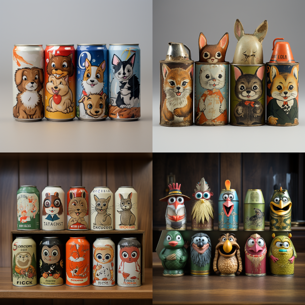 Midjourney Bot 更新时间:2023-08-31 18:45Animals in cans; The rabbit's body is packed in a metal can; The lion's body is packed in a metal can; Duck's body is packed in a metal can; Rat's body is packed in a metal can; 2D; Cartoon; Fairy tale style; The promotion of animal heads excesses 50% of their own image --s 206 --c 8 --ar 1:1 --style raw --v 5.2