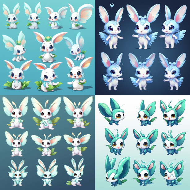 Midjourney Bot 更新时间:2023-08-31 18:45Butterfly Rabbit Sprite, game assets, character design, full body character design, character design multiple poses. --ar 1:1 --style raw --v 5.2