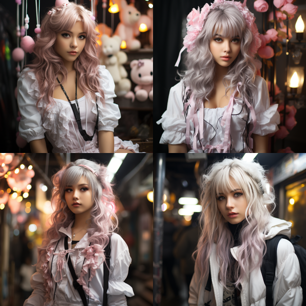 Midjourney Bot 更新时间:2023-08-31 17:48White stockings,girly outfit,decora kei outfit,kawaii outfit,wet hair,silver hair,delicate skin texture,full lipsheavy bright makeupnatural volumetric --ar 1:1 --style raw --v 5.2 --s 750