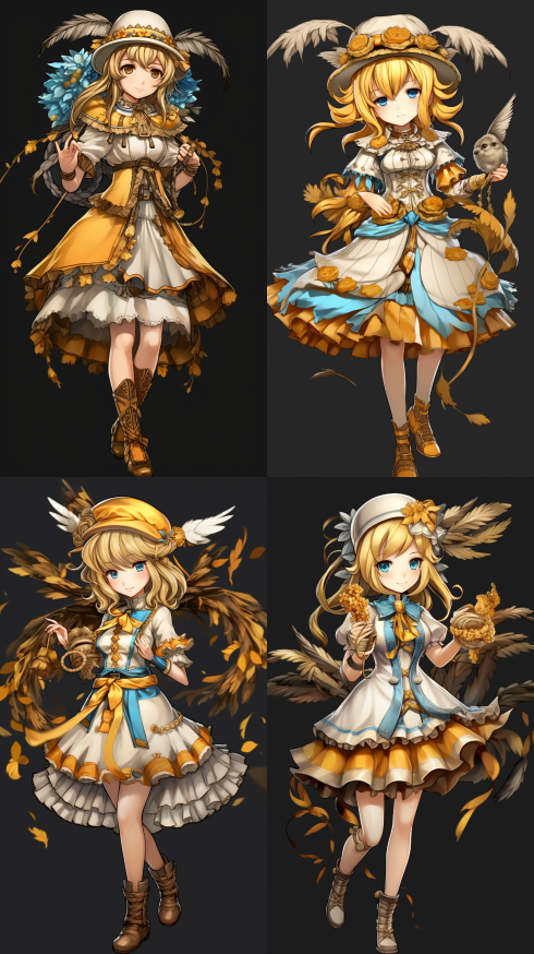 Midjourney Bot 更新时间:2023-08-31 17:41An elf wearing clothes made of wheat ears, with a small bird flying above its head. Character design, game assets, full body character design, character design with multiple poses. --iw 2 --ar 9:16 --style raw --v 5.2 --s 750