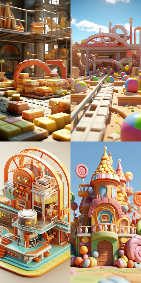 Midjourney Bot 更新时间:2023-08-31 17:42The c4d software has a cute style, candy colored, and bread processing factory. There is a candy green and orange windmill on the left, next to some candy green buildings. The building is surrounded by some candy green conveyor belts, and the visual center is the shape of two bread slices. A game machine is sandwiched between the bread slices, and there is a plate below one of the bread slices, with three parallel small bottles on the plate, and three pink bottles in front, Purple and green small balls, the overall model is in a box similar to a small villa, with a candy green color. The upper layer is a light yellow conveyor belt, transporting some small blocks. The overall model is on a candy green and white floor tile, with a candy orange door on the right, and a vertical small sign. At the front is a long small table with a teapot and small balls --s 705 --c 73 --ar 1:2 --style raw --v 5.2
