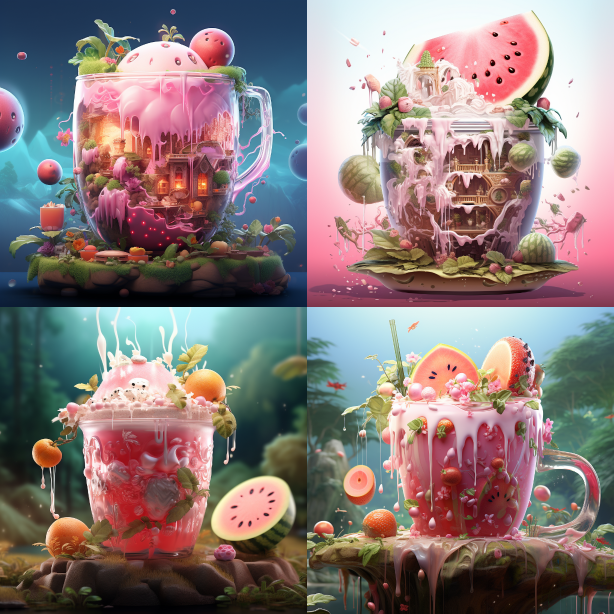Midjourney Bot 更新时间:2023-08-31 17:44The top of a cup is a pink milk tea with a milk cap, surrounded by watermelons and a forest background. It features a surreal fantasy style, charming character illustrations, powerful liquid explosions, vray rendering, rich and immersive nature, and excellent atmosphere. --ar 1:1 --style raw --v 5.2