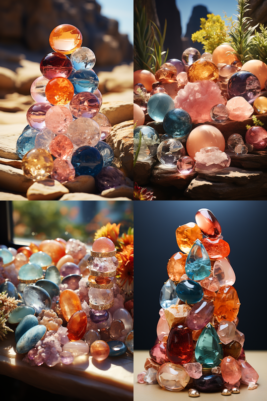 Midjourney Bot 更新时间:2023-08-31 17:38Jewelry advertisement for a collection called Glass and Gems, with no text or people in the photo Photo make of different hyperrealistic gemstones like rose quartz, moss agate, and jasper Riverside California Sunny vibe Blue, pink, and orange aesthetic --ar 2:3 --style raw --v 5.2 --s 750