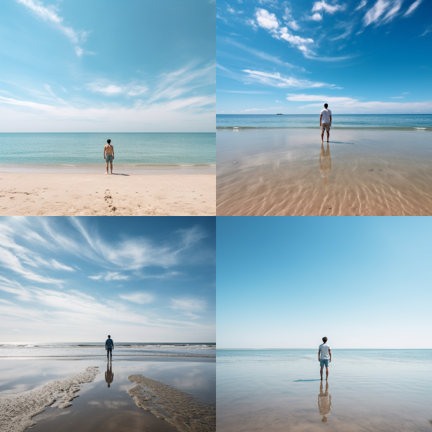 Midjourney Bot 更新时间:2023-08-31 17:47The man faces the sea and turns his back to the camera,high resolution,Ultra wide view shot,symmetrical composition,full body character design,Vanishing point composition,beach background --ar 1:1 --style raw --v 5.2