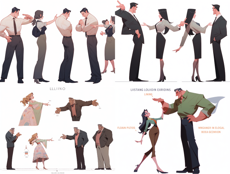 Midjourney Bot 更新时间:2023-08-31 17:46A woman points at another man, Man turns his head, in the style of Klaus pillon, Disney animation, Giovanni (nino) Costa, lifelierendings, angled forms, strong financial,full body character design --ar 4:3 --niji 5