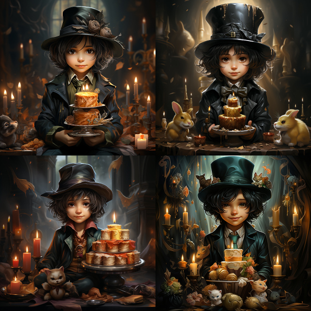 Midjourney Bot 更新时间:2023-08-31 17:40A Chinese boy wearing a magician's hat and holding a cake has created a sweet and carefree society, with character design and happiness,Jasmine Becket-Griffith --ar 1:1 --style raw --v 5.2 --s 750