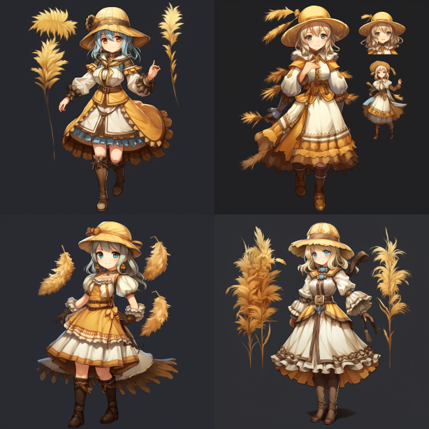 Midjourney Bot 更新时间:2023-08-31 17:48The clothes are made of wheat spikes. Character design, game assets, full body character design, character design multiple poses. --iw 2 --ar 1:1 --style raw --v 5.2