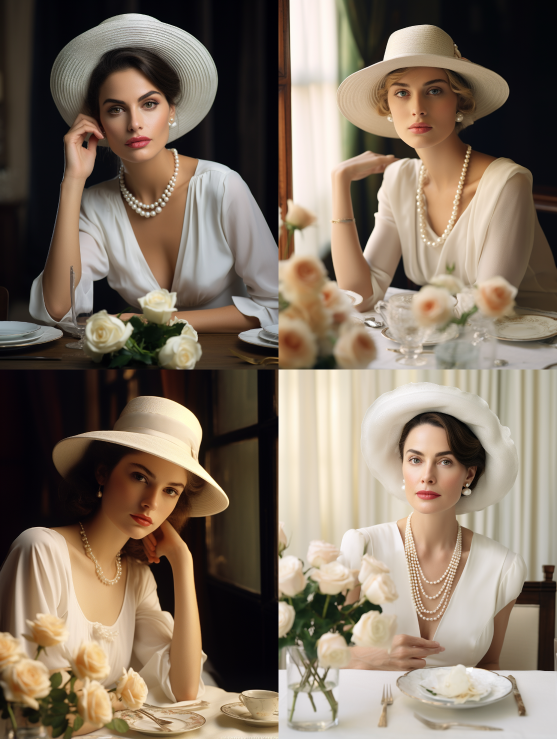 Midjourney Bot 更新时间:2023-08-31 17:42Elegant lady, wearing a hat, pearl earrings, pearl necklace, white shirt, sitting side by side facing the camera, looking at the camera with indifferent eyes, white roses on the table, mid shot --c 3 --ar 3:4 --style raw --v 5.2