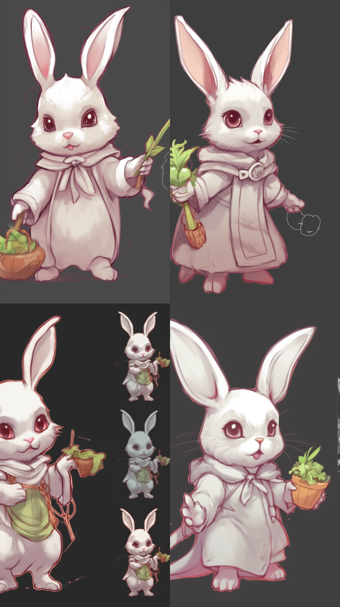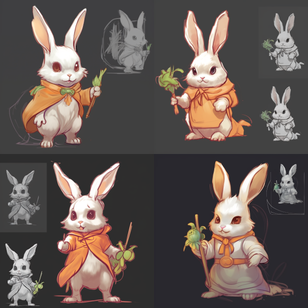 Midjourney Bot 更新时间:2023-08-31 17:46A rabbit elf holding a large carrot with both hands, character design, game assets, full body character design, character design with multiple poses. --iw 2 --ar 1:1 --style raw --v 5.2