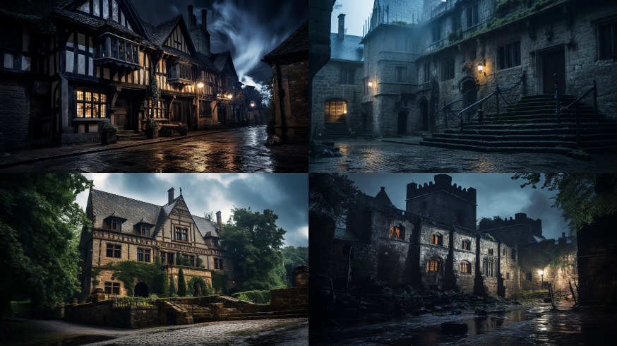 Midjourney Bot 更新时间:2023-08-31 17:30A modern yet stormy medieval building, haunted by evil spirits --ar 16:9 --style raw --v 5.2