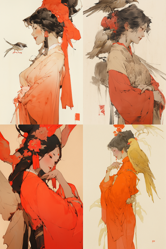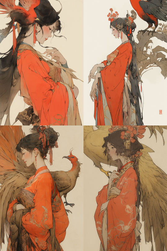 Midjourney Bot 更新时间:2023-08-31 17:34an ancient Chinese beauty in the Tang Dynasty, solo, wearing chinese costumes, next to the giant Vermilion Bird, flying vermilion, red sacred bird, ancient Chinese sacred beast, dreamy, head close-up, a chinese ink painting, art by Qiu Ying, Zhang Daqian, Zhang Daqian, lemon yellow and fluorescent red color, bright. --s 750 --uplight --ar 2:3 --style expressive --niji 5