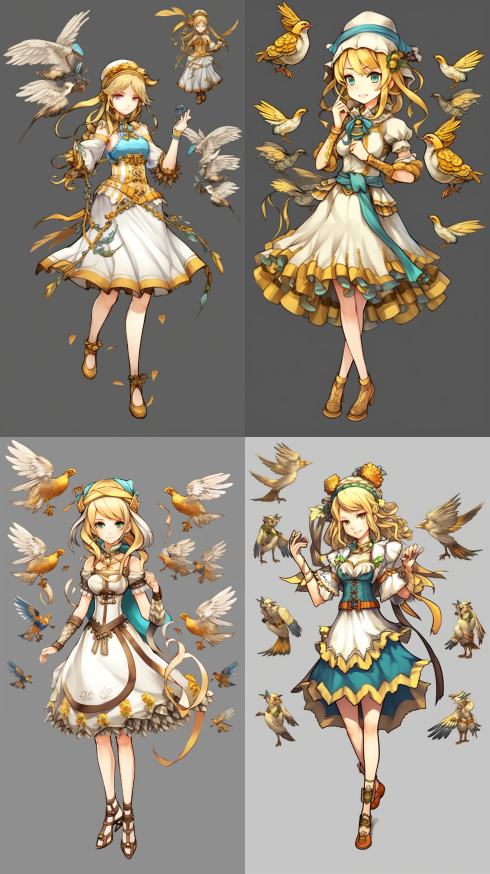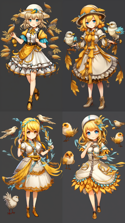 Midjourney Bot 更新时间:2023-08-31 17:37Elves, wheat, birds,character design,game assets,full body character design,character design multiple poses --iw 2 --ar 9:16 --style raw --v 5.2