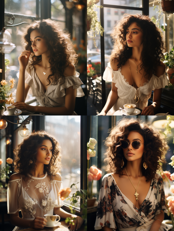 Midjourney Bot 更新时间:2023-08-31 17:32Outdoor coffee shop, elegant lady, black curly hair with flowers, gold necklace, white dress, she is looking at the surrounding environment, sunshine, close up --c 5 --ar 3:4 --style raw --v 5.2 --s 250