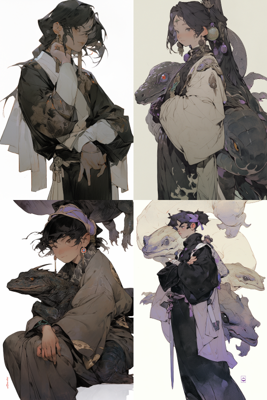Midjourney Bot 更新时间:2023-08-31 17:35an ancient Chinese young boy, solo, wearing chinese costumes, next to the Black Tortoise, ink blending, art by Qiu Ying, Zhang Daqian, purple and black color, bright. --s 750 --uplight --ar 2:3 --style expressive --niji 5