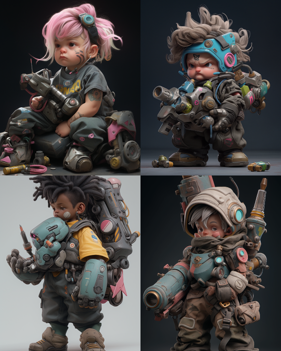 Midjourney Bot 更新时间:2023-08-31 17:313D toys, Cyberpunk style, A little boy dressed in mechanical arm preparation: 2 In the image: 1, 3- years - old, His hands have two rocket launchers, His arm structure is very granular complex, The arm is very large and objective, light pin hair, light pin eyes, blue pupils, His arm is gray, blue, pink, yellow, and white, He is wearing a Helmet on his head, There is glass on the helmet, there are electrical requirements and letters on the arm, cut, best quality, mockup blind box, pop mart design, full body, vivo colors, street style, lots of details, metallic texture, clean background, light gray background, white environment, 8k HD, Dark background, art, 3D, C4D, blend, OC rederer, high detail --s 180 --ar 4:5 --style expressive --niji 5