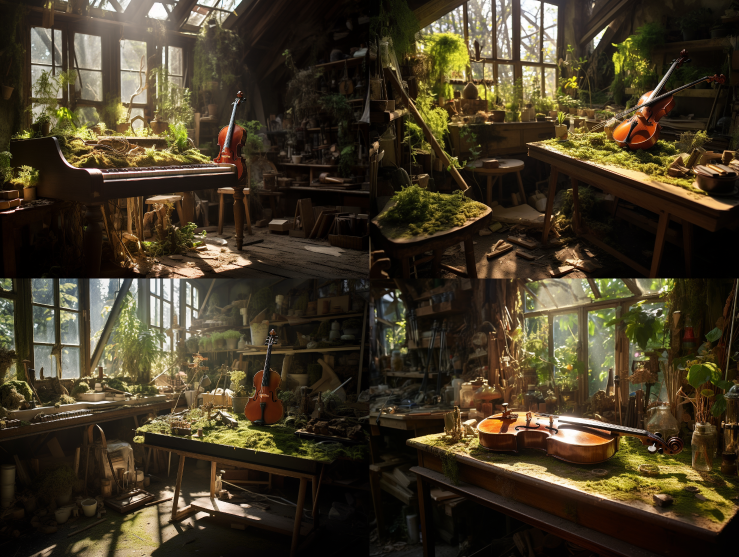 Midjourney Bot 更新时间:2023-08-31 17:30In an underground studio, sunlight shines through a skylight onto a wooden workbench. On the tabletop sits a violin, with intricate details that exude a remarkable texture. The violin is exquisitely designed, with each component precisely installed, emitting a mysterious aura. The surrounding workbench is covered with various moss plants and moss, and the floor is covered in dust, creating a sense of apocalypse. On the table are tools for making violins, leather backpacks, and other items. The glossy texture of the violin contrasts sharply with the aged studio, while the moss plants and sunlight bring a hint of vitality to the apocalyptic atmosphere. --ar 4:3 --style raw --v 5.2