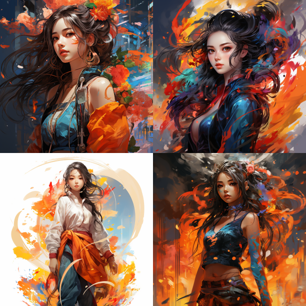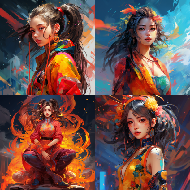 Midjourney Bot 更新时间:2023-08-31 17:08Full body shot, A Chinese girl with two elements. young girl with single ponytail, bold and vibrant colors, fantasy, Digital painting, --ar 1:1 --style raw --v 5.2 --s 250