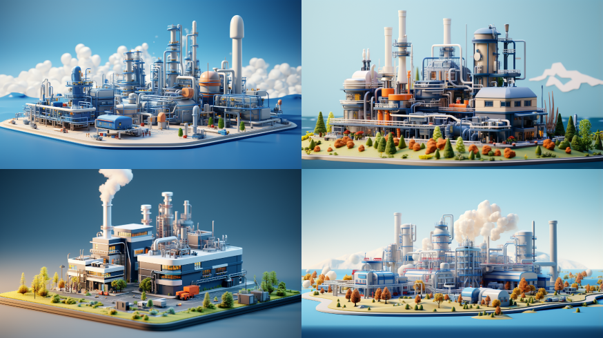 Midjourney Bot 更新时间:2023-08-31 17:14A minimalist 3D factory model with multiple color schemes using light indigo, blue, and white for construction. The factory on the grass has equipment such as spray towers, workshop buildings, MVR, warehouses, and pipelines --s 348 --ar 16:9 --style raw --v 5.2