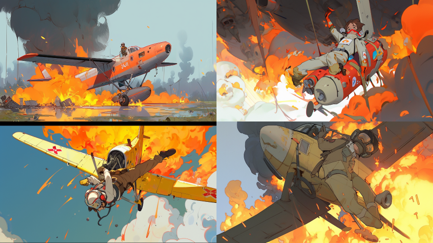 Midjourney Bot 更新时间:2023-08-31 17:14A pilot parachuted out of a plane that was on fire. There was a rescue plane nearby. --ar 16:9 --style expressive --niji 5
