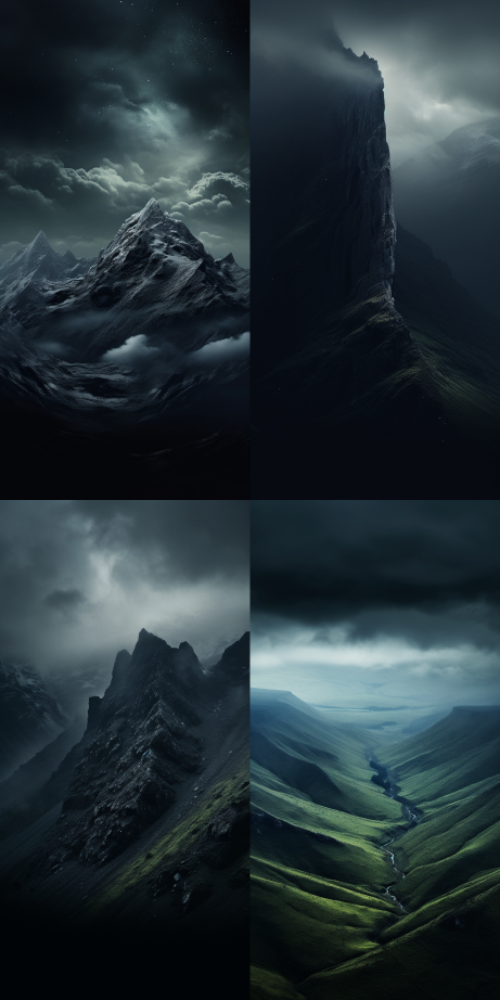 Midjourney Bot 更新时间:2023-08-31 17:19Black mountains stand tall, dark sky, towering mountains, mysterious and calm atmosphere, 8k, high-definition, high detail, --ar 1:2 --style raw --v 5.2