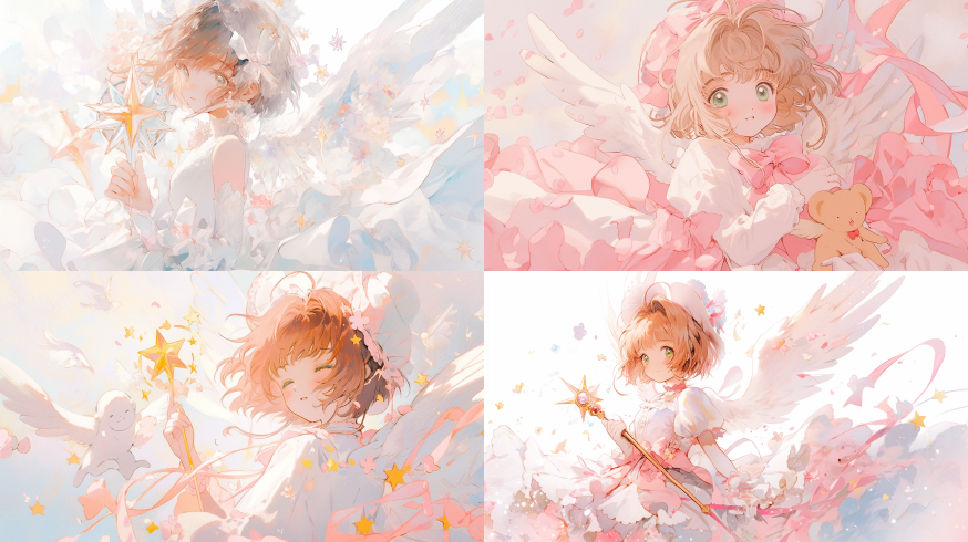 Midjourney Bot 更新时间:2023-08-31 17:18the picture is done in white , in the style of Card Captor Sakura manga style, , blink-and-you-miss-it detail,kawaii aesthetic, high-keyed palette, little star,precisionist art ,Dream colors,low saturation ,maid headdress ,Watercolor paint,Pastel,oil painting ,Ivory White tones --ar 16:9 --niji 5