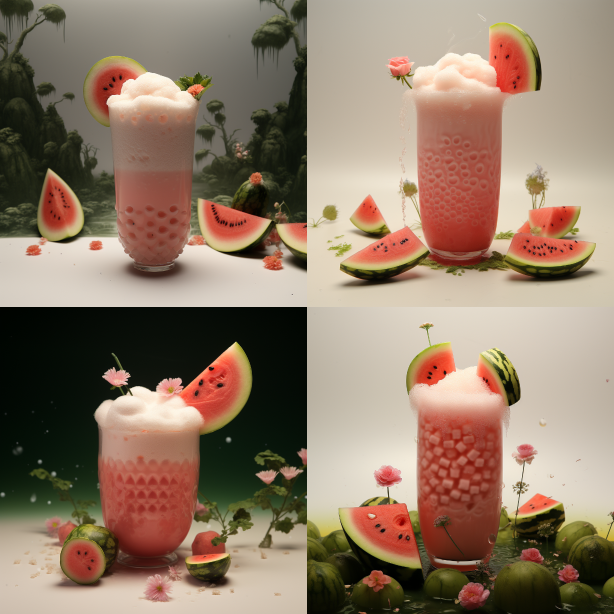 Midjourney Bot 更新时间:2023-08-31 17:20The top of the cup is white foam, and the bottom is a pink cocktail filled with flowers and plants in the forest landscape. The cup is surrounded by watermelons and the background is forest. It is characterized by surreal fantasy style, charming figure illustrations, Vray rendering, rich and immersive nature and good atmosphere --ar 1:1 --style raw --v 5.2