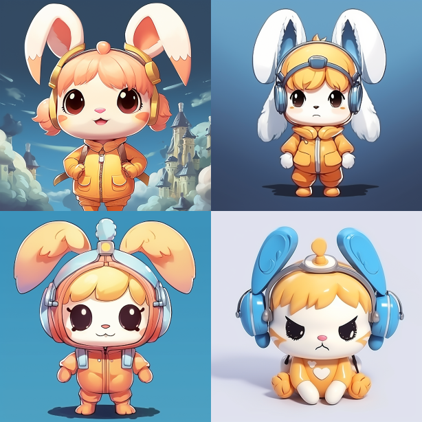 Midjourney Bot 更新时间:2023-08-31 17:092D plane, cartoon style, fairy tale feeling, sad rabbit, inflatable body, strong stylization, head accounts for over 60% of the proportion. --s 285 --c 9 --ar 1:1 --style raw --v 5.2