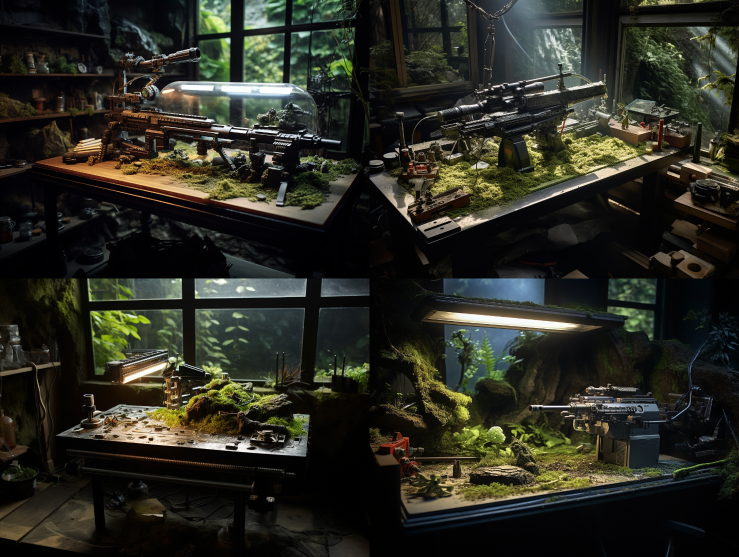 Midjourney Bot 更新时间:2023-08-31 17:11In an underground studio, sunlight shines through a skylight onto a wooden workbench. On the tabletop, there is a toy gun made of futuristic black metal, exuding an incredible texture. The design of the toy gun is intricate and delicate, with each part precisely installed, emitting a powerful and mysterious energy. The surrounding workbench is covered with various moss plants and moss, with dust scattered on the floor, creating a sense of apocalypse. The accessories of the toy gun are placed on the table, creating a sharp contrast between the metallic texture of the toy gun and the aged studio. The moss plants and sunlight bring a hint of vitality to the apocalyptic atmosphere. --ar 4:3 --style raw --v 5.2