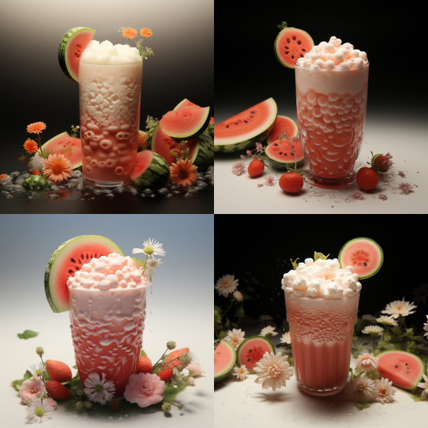 Midjourney Bot 更新时间:2023-08-31 17:20The top of one cup is white foam, and the bottom is a pink cocktail filled with flowers and plants in the forest landscape, surrounded by watermelons. Its characteristics are a surreal fantasy style, charming character illustrations, Vray rendering, rich and immersive nature, and a good atmosphere --ar 1:1 --style raw --v 5.2