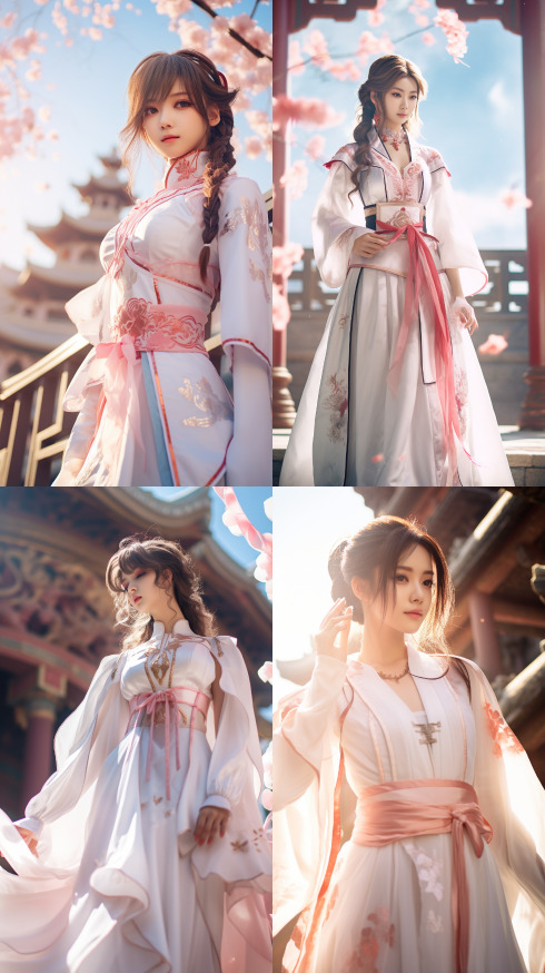 Midjourney Bot 更新时间:2023-08-31 17:14A Chinese woman wearing complex white and pink clothes, with Chinese architecture, high-definition image quality, super details, soft lighting, cosplay, bright sunlight, light and shadow effects, movie quality, smile, anime, dreamy colors, waist shooting --ar 9:16 --style raw --v 5.2