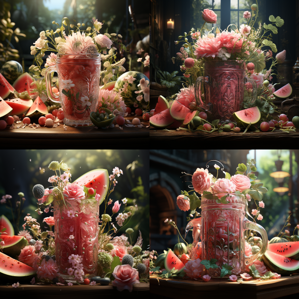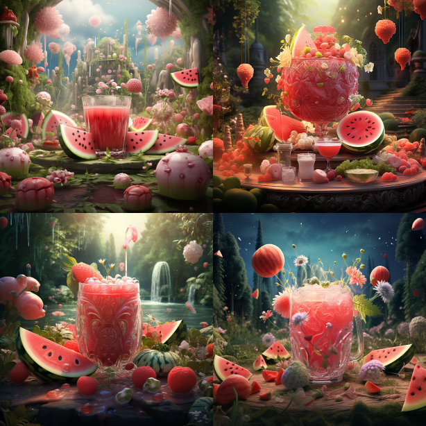 Midjourney Bot 更新时间:2023-08-31 16:21A watermelon flavored cocktail filled with flowers and fruits from the forest landscape, surrounded by many watermelons, features a surreal fantasy style, charming character illustrations, vray rendering, rich and immersive nature, and excellent atmosphere. --ar 1:1 --style raw --v 5.2