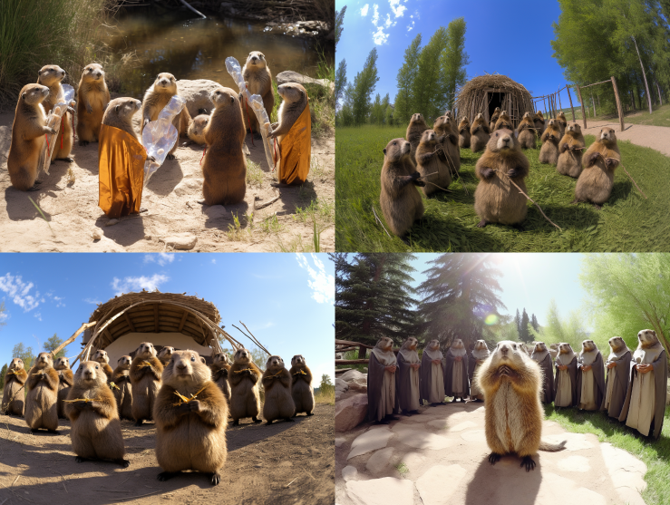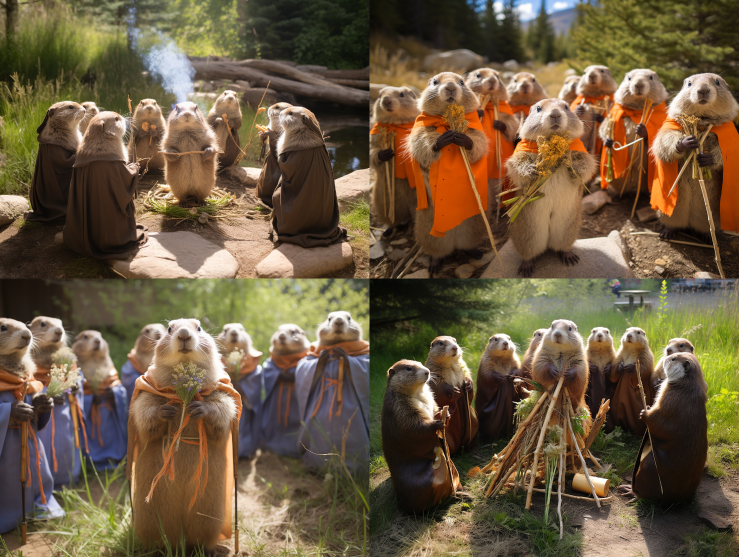 Midjourney Bot 更新时间:2023-08-31 16:21Panorama, in the bushes, a group of marmots are arranged in a circle. One of the marmots is dressed in a wizard's costume and holds a wooden stick. In the middle of the circle for the ritual gathering is a bag of whole wheat bread wrapped in transparent plastic bags, with sunlight spots on the ground --c 3 --ar 4:3 --style raw --v 5.2