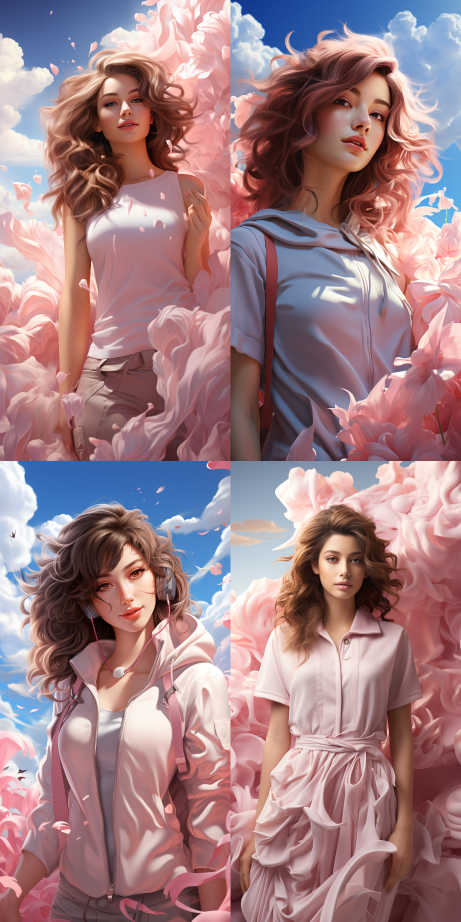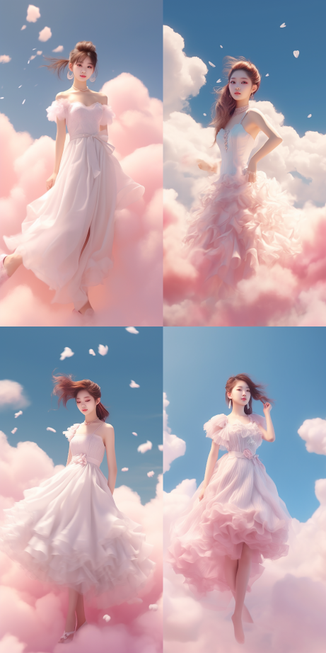 Midjourney Bot 更新时间:2023-08-31 16:27A cute Chinese girl with three-dimensional facial features, standing on pink clouds, bright light hitting her face, soft and comfortable light blue sky, with artistic details and natural rendering style, organic flow form, light white and light pink clouds, dreamy style, realistic, and very high-end fashion --ar 1:2 --style raw --v 5.2 --s 750