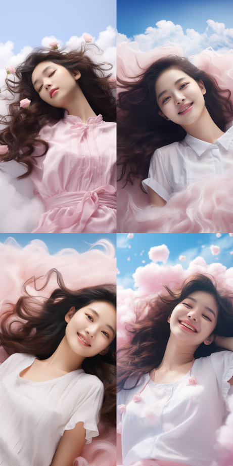 Midjourney Bot 更新时间:2023-08-31 16:29An 18-year-old Chinese girl lies on a pink cloud, with flowing hair, a beautiful smile, and clean, fair skin. The light blue sky is soft and comfortable, with artistic details and a natural rendering style. The organic flow forms pale white and light pink clouds, creating a dreamy and high-end fashion style. --ar 1:2 --style raw --v 5.2