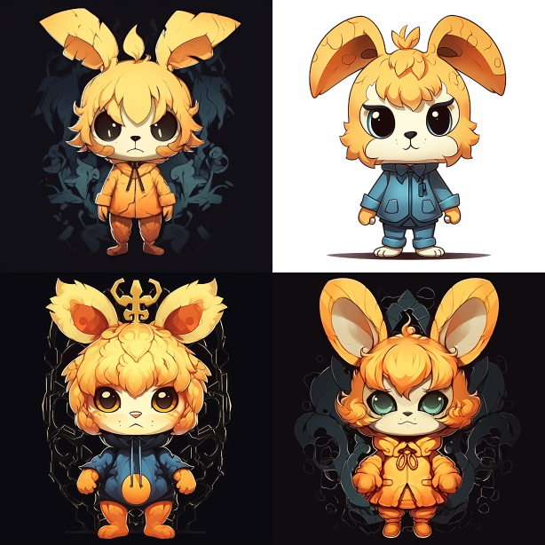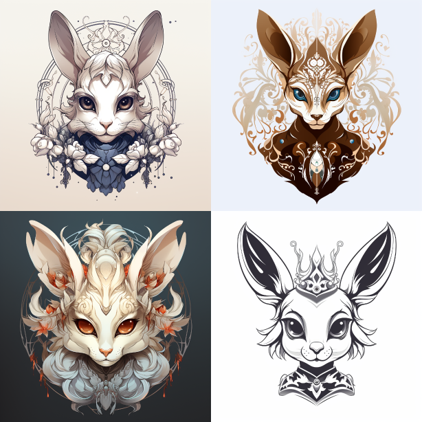 Midjourney Bot 更新时间:2023-08-31 16:20Hollow-eared rabbit, fairy tale style, 2D simple sketch, rabbit queen, head occupies over 60% of the body. --s 285 --c 9 --ar 1:1 --style raw --v 5.2