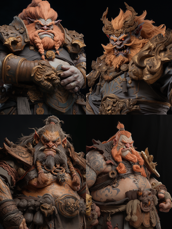 Midjourney Bot 更新时间:2023-08-31 16:27Facing the camera, Half body, Front, Monster, 3D render, Chinese character face, Black background, orange hair, blue face, orange eyes, A very Majestic, physically chubby, Men, goatee, Anger, Gold arm, Clock, Western Zhou dynasty, traditional Chinese mythology, intelligent use of composition, inspiring use of textures, ZB rush Octane Render, portal ph otography, 16K, best quality --ar 3:4 --style expressive --niji 5