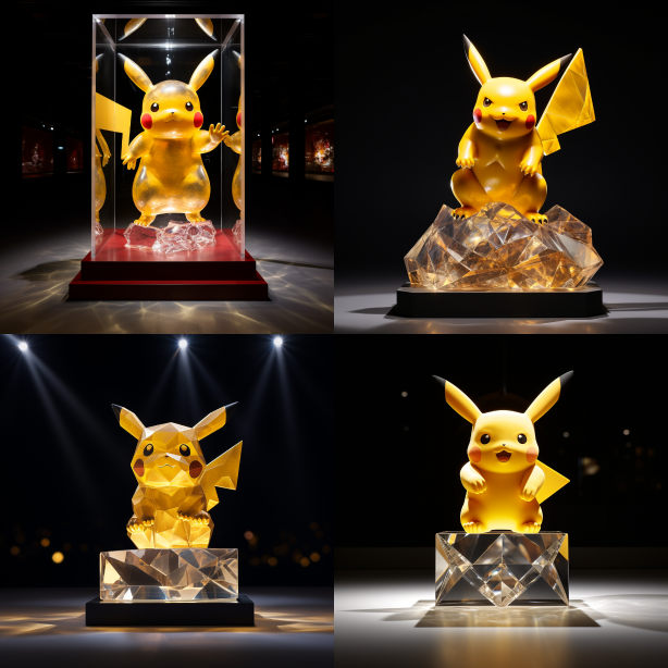 Midjourney Bot 更新时间:2023-08-31 16:25Crystal material, Pikachu, exhibition stand, fixed lighting, frontal view, mid-range shot, clean background. --ar 1:1 --style raw --v 5.2