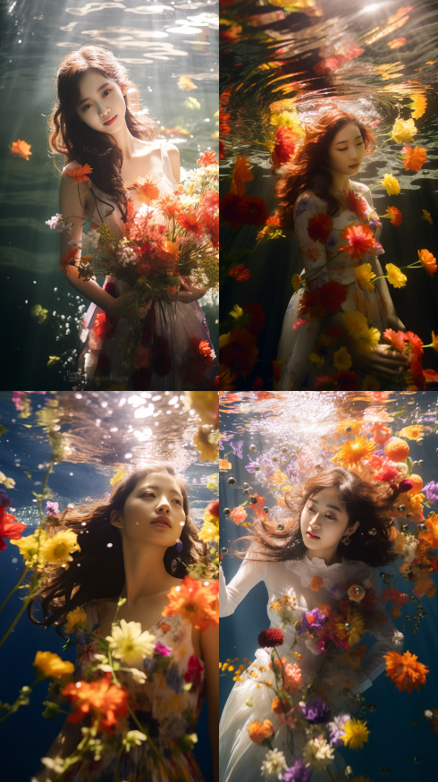 Midjourney Bot 更新时间:2023-08-31 14:52A Japanese high school student, wearing a Chinese dress and holding a sea of flowers, smiles underwater. The sunlight shines through the water, scattering colorful light. She is super realistic, ultra wide angle, 4k, product photography, minimalist, --ar 9:16 --style raw --v 5.2